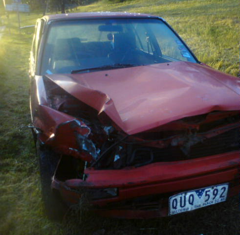 Then it stopped. For a moment the tape player continued (Bertha the Mirth Mobile was an old car). I flicked the ceiling light on to see the damage, realised the engine was still going and tried to get out. Couldn’t. The driver’s side door was bent out of shape and stuck fast. I freed myself from the seatbelt, before launching myself over the hand brake and passenger’s side seat covered in chips of broken glass and out the door. I have never moved as quickly before or since. Then I started screaming for someone, anyone, to stop.