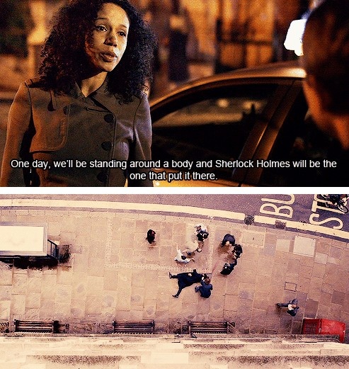 Indeed the third series ends in the same way as the first series, with Sherlock in the red spot lights of guns, next to Watson, while everything is about to go Moriarty. It also mirrors the end of the first episode – with a shooting to save someone – only with the Sherlock and Watson’s roles reversed and the ‘debt’ paid. This is what makes it beautiful writing, and not at all like life. This is escapism for the attentive viewer or detective fiction as High Art.