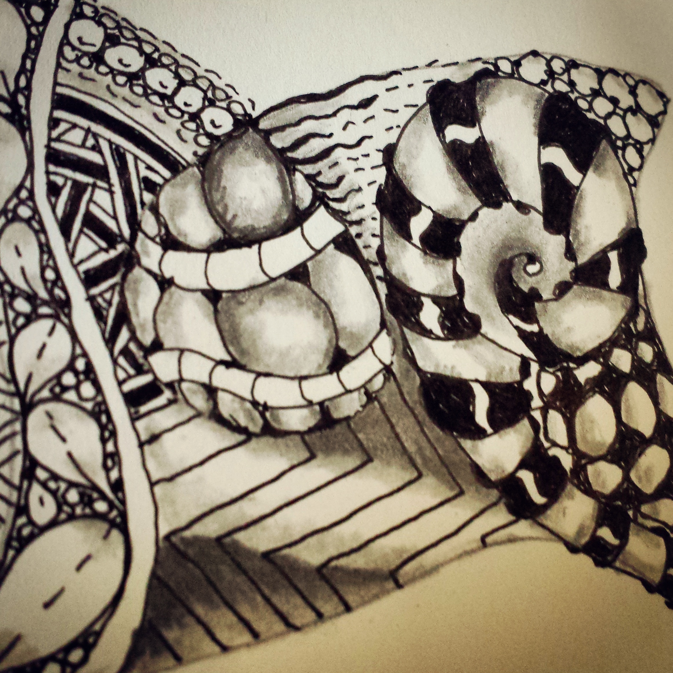 If you don’t buy into the Zentangle vibe that’s ok, because I’d never heard of it before. The point is, this class was fun, and what you need to be able to take part is minimal. At the very least the requirements are paper, fine point pen, pencil, and tortillon (paper smudge stick).