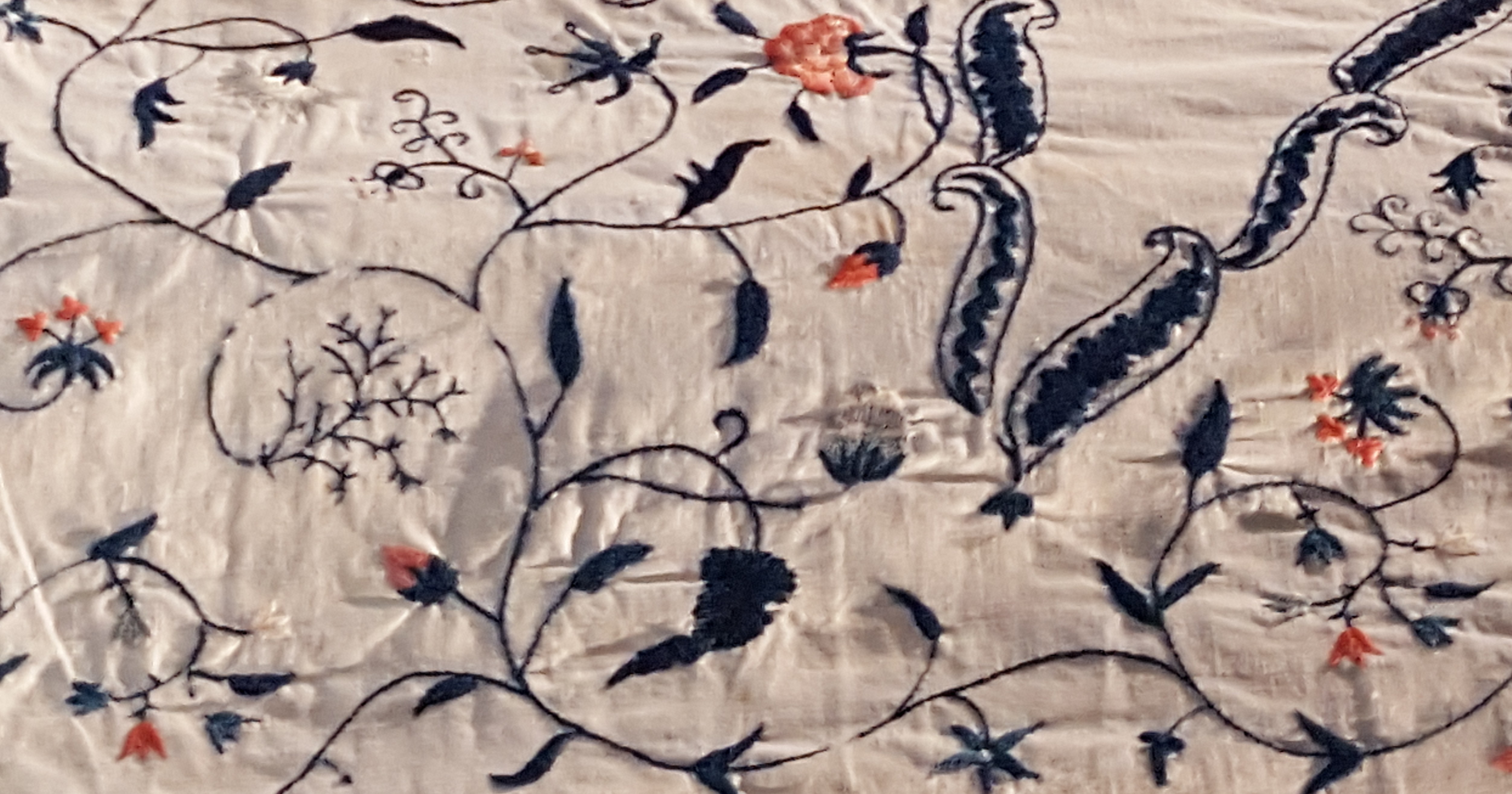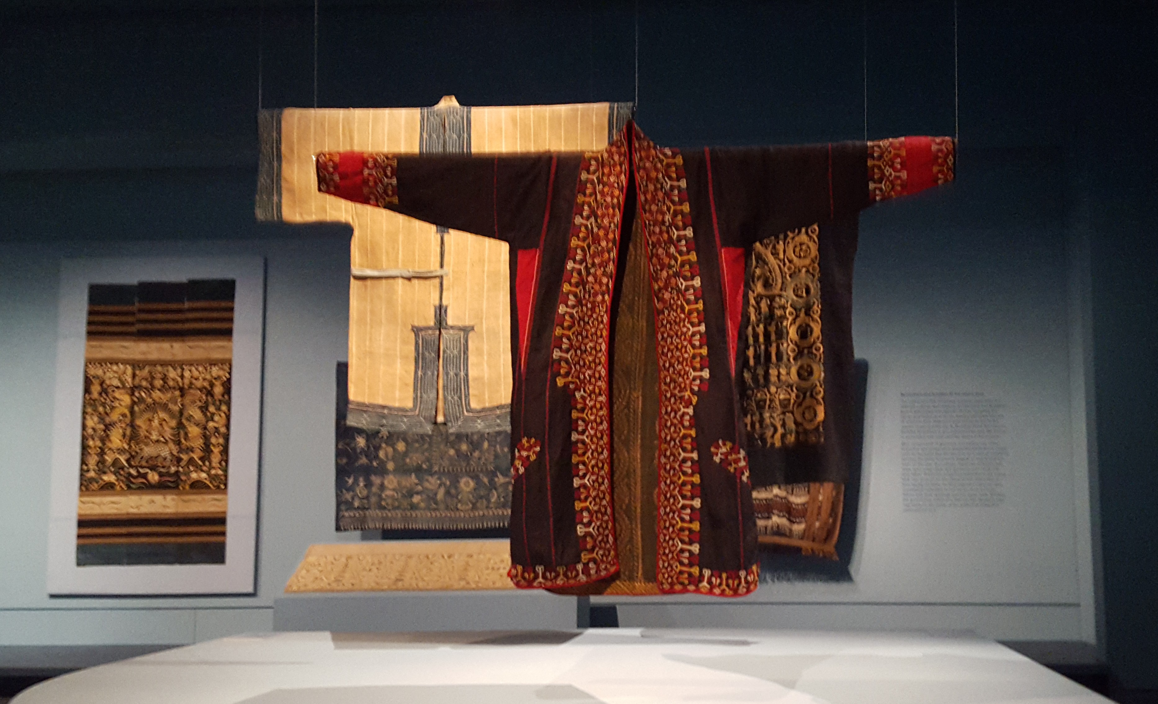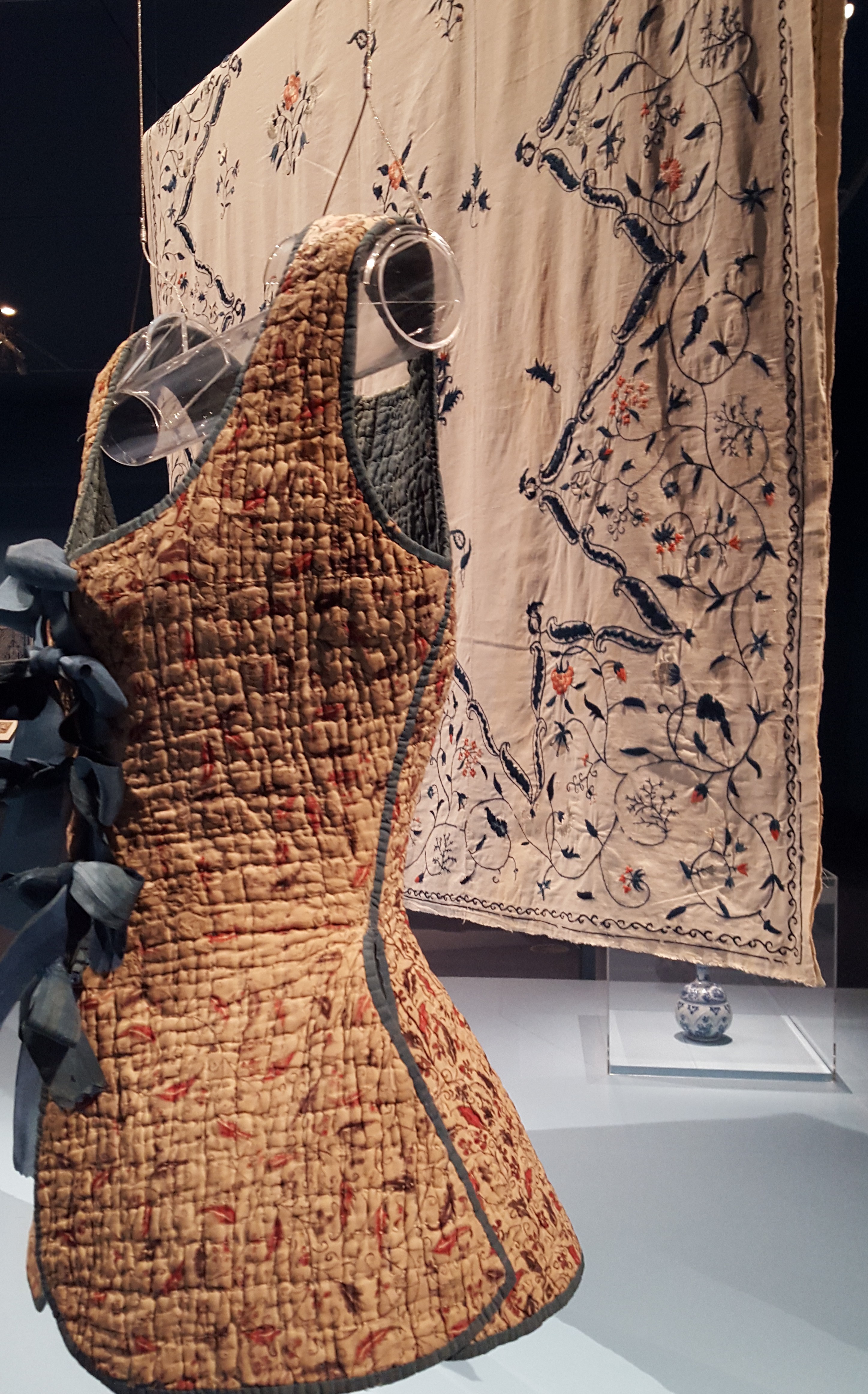 I liked it because Delftware was next to illustrations from India, while porcelain from China sat beside English bedspreads, and jars from Worcester were positioned next to items from Japan, Turkey and Indonesia. Garments and bedding hung triptych-like to be viewed from every angle.
