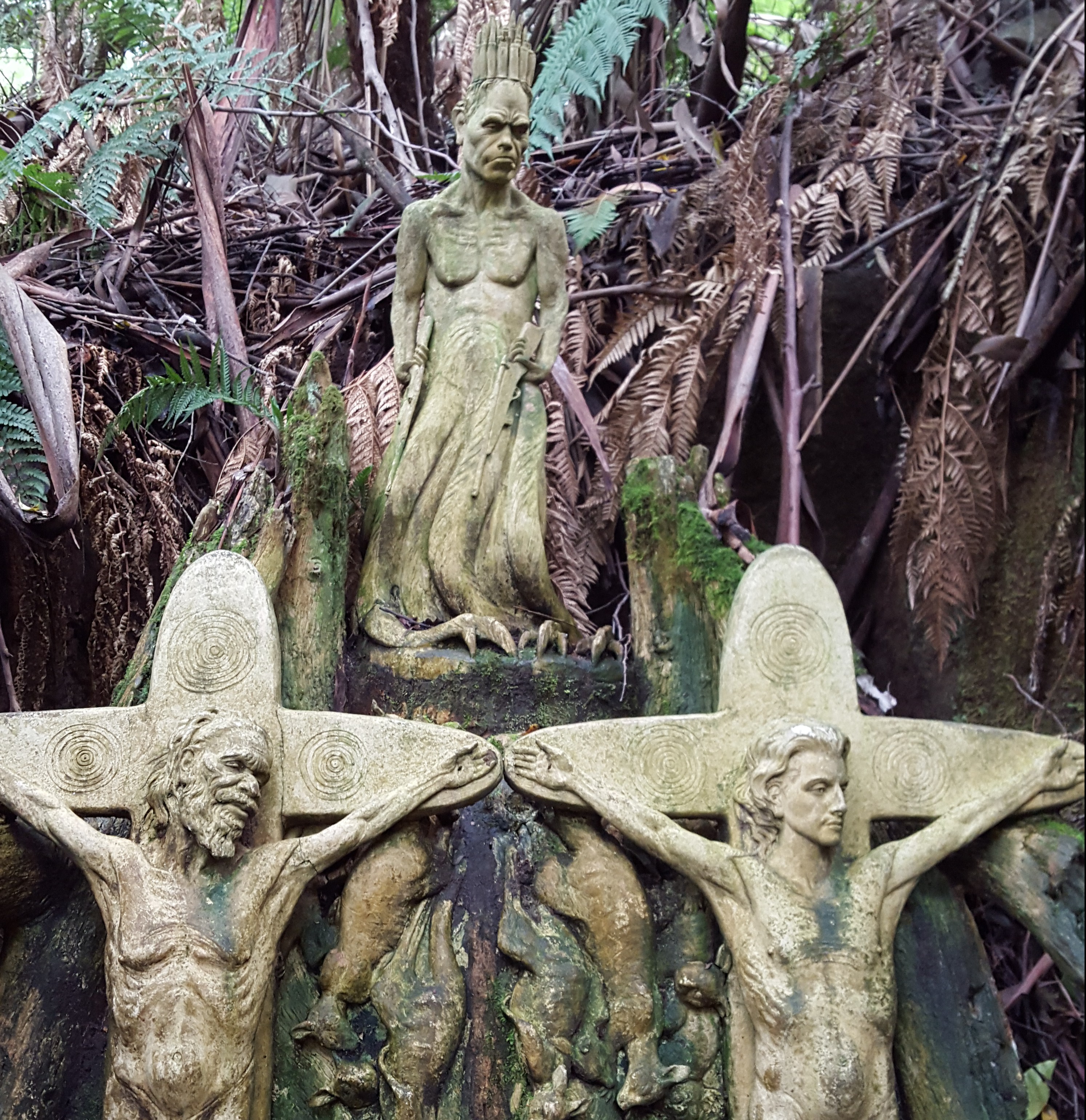 He clearly depicts an idealised version of himself in his sanctuary work, but mostly his sculptures are of Aboriginal men, women and children. Sometimes, he uses Christianity to convey the idea that the land, its animals and people and advocates like himself, were crucified to a world represented by a bullet crowned figure whose clawed hands wield guns.