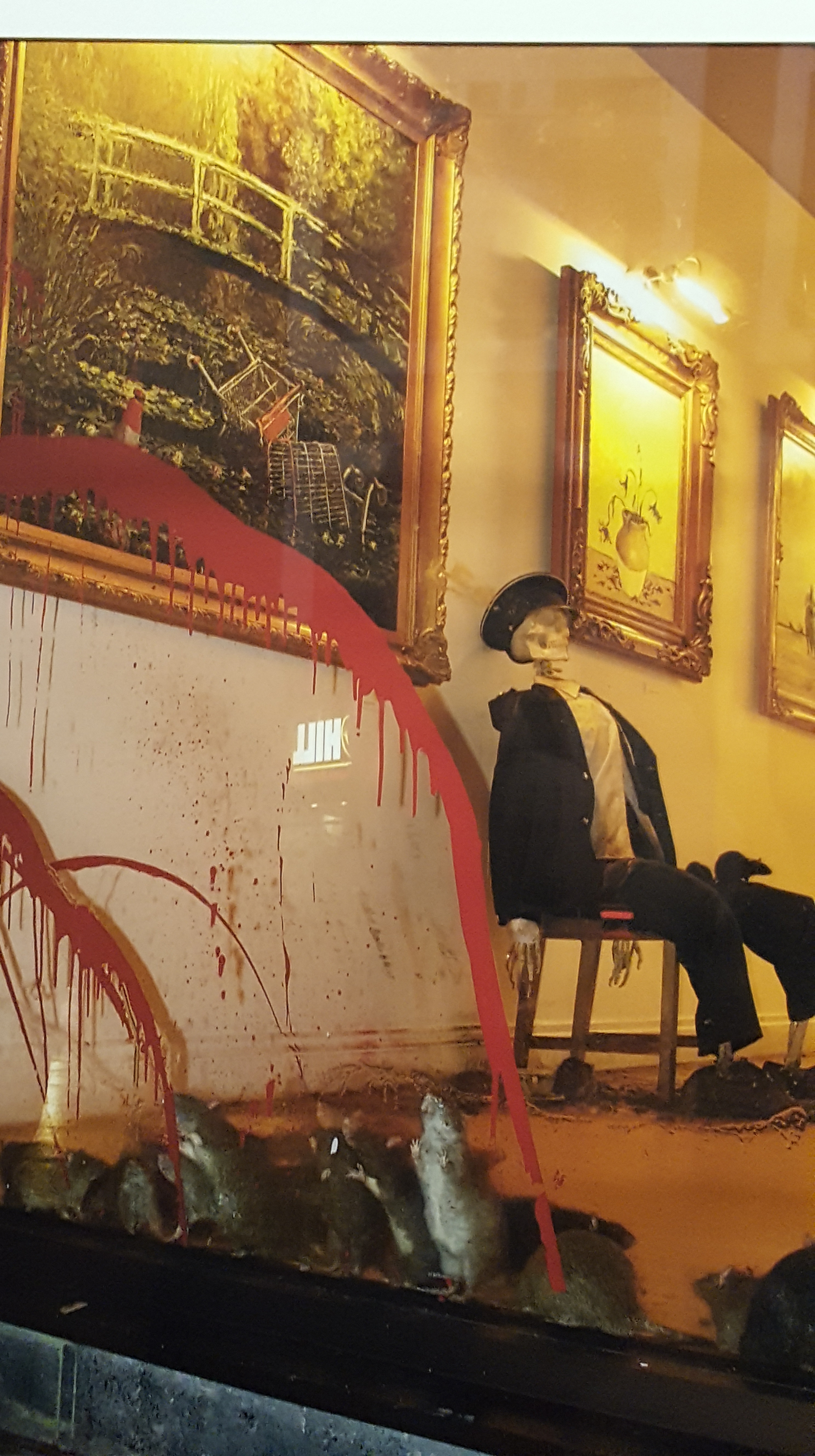 Pay attention to the art works outside the gallery. They are contributions that also critique the nature of the exhibit and the fact it was not approved by Banksy himself.