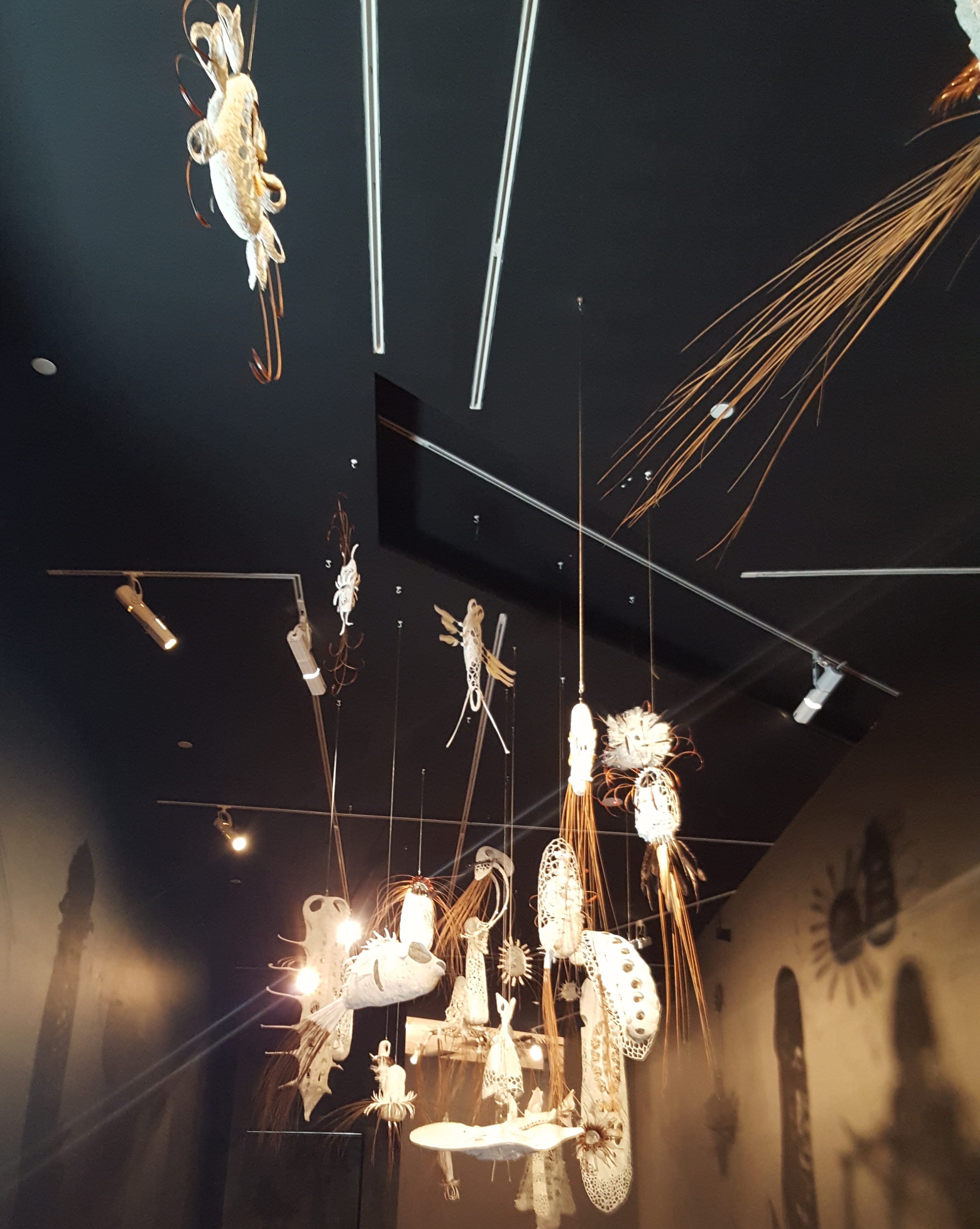 I can’t adequately describe nor show my favourite piece, (although I did take this one picture below). I’ll try, though, because if you can’t get to see it, you shouldn’t miss out entirely. Imagine walking in a room of warmly lit, bone-bright white sea creatures, hanging from the ceiling, casting shadow shapes on the black walls, and on the floor, all around, so you feel a part of something living, yet fossilised, suspended in time and in the air in the cool quiet of this still space.