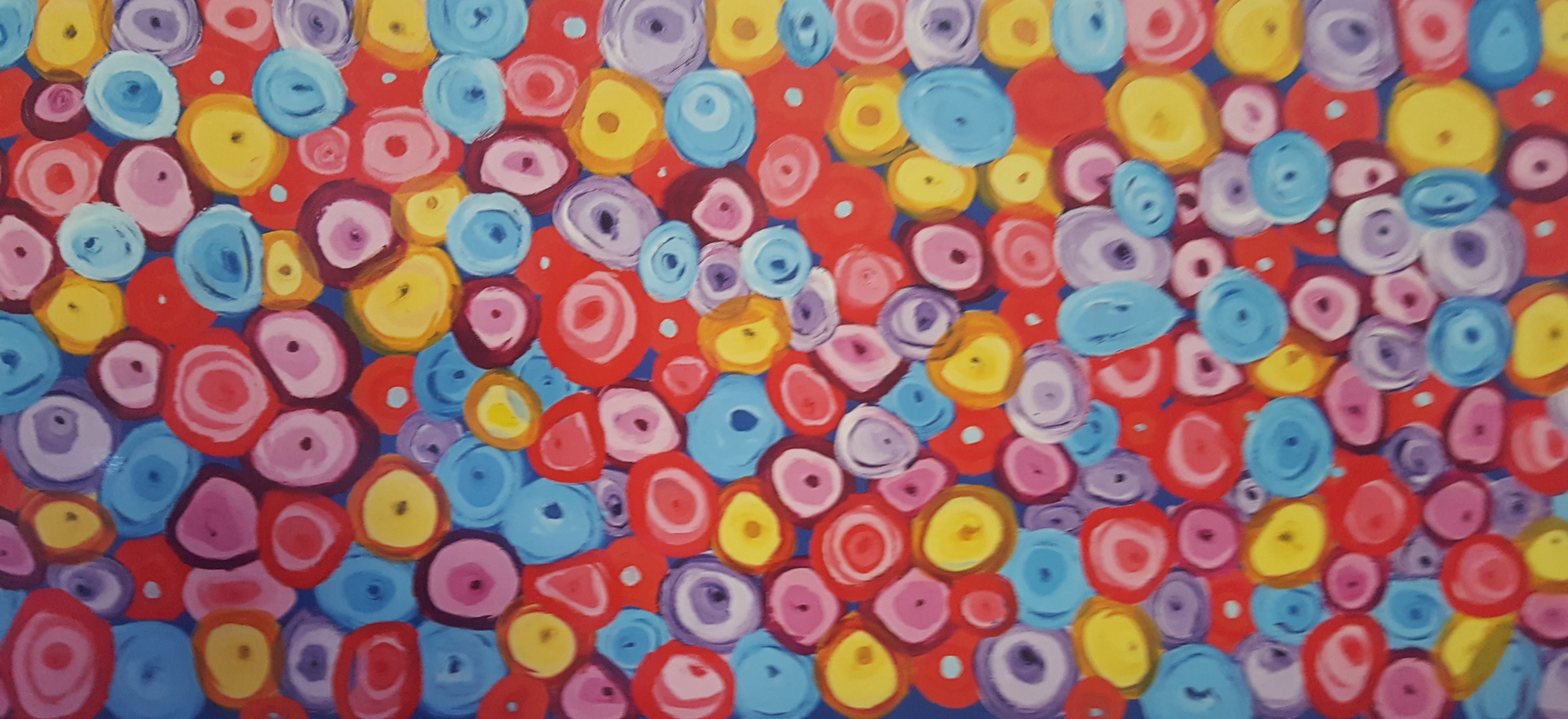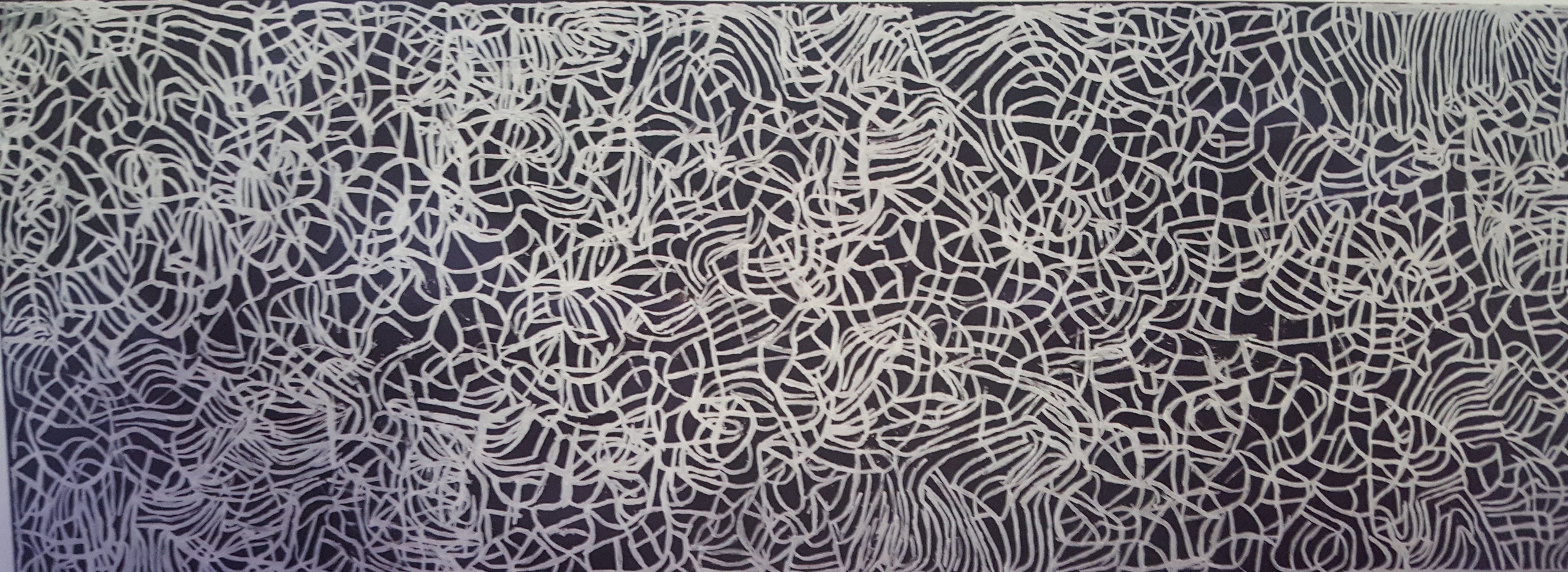 My Sunday’s are currently for art. Mine and other’s. It began with the notion to (try to) attend all four Drop By Drawing events at the National Gallery of Victoria, for two hours every Sunday. I haven’t, in fact missed any. This week I first took at look at the Art of Banksy (see earlier post). Then I had some time, and choices. I could visit John Olsen’s You Beaut Country, or David Hockney’s electronic garden wonderland exhibit. However, in the spirit of Sherlock‘s Dr Watson avoiding men explaining the world, instead, I opted for Who’s Afraid of Colour, featuring an array of works by 118 Australian Indigenous women.
