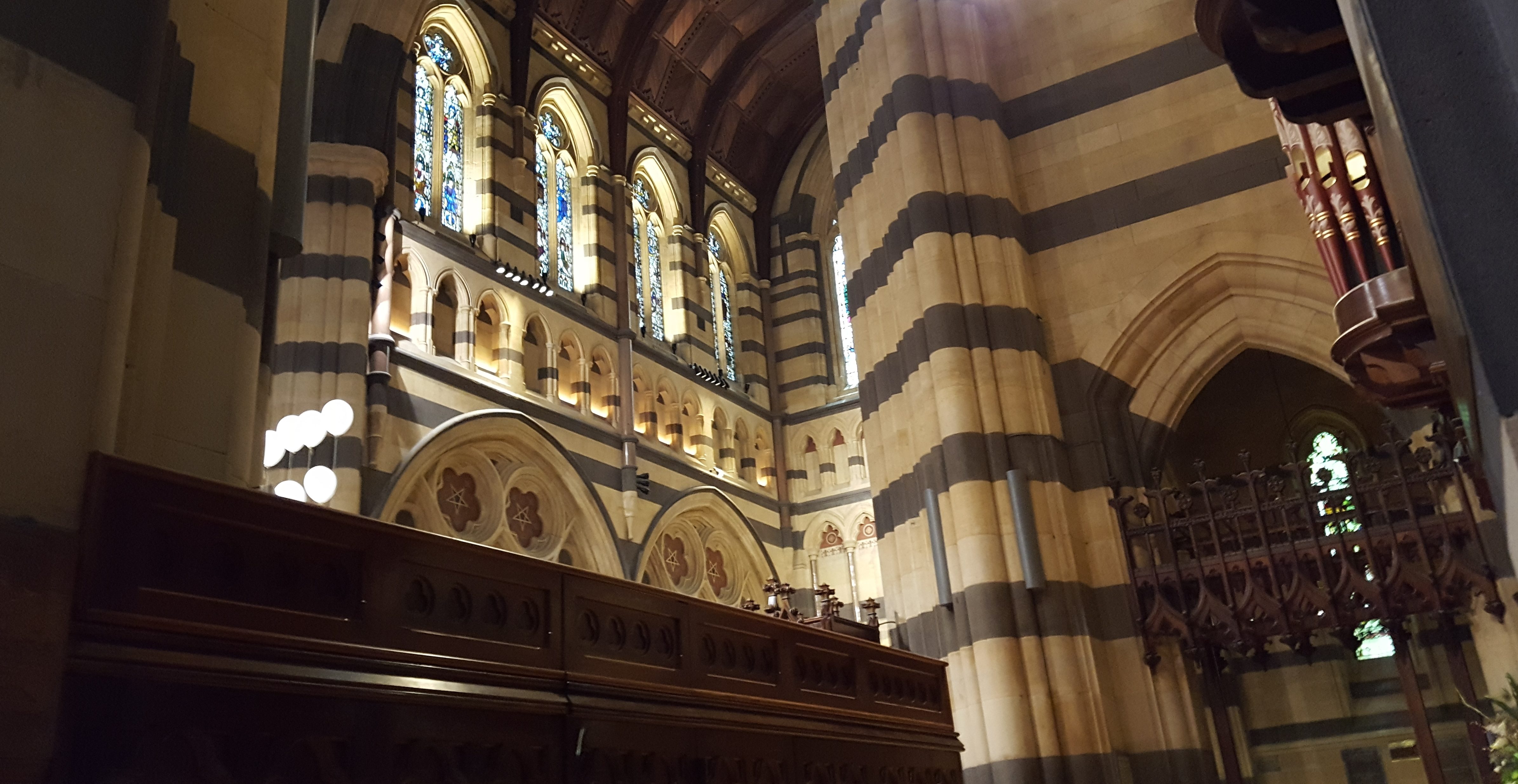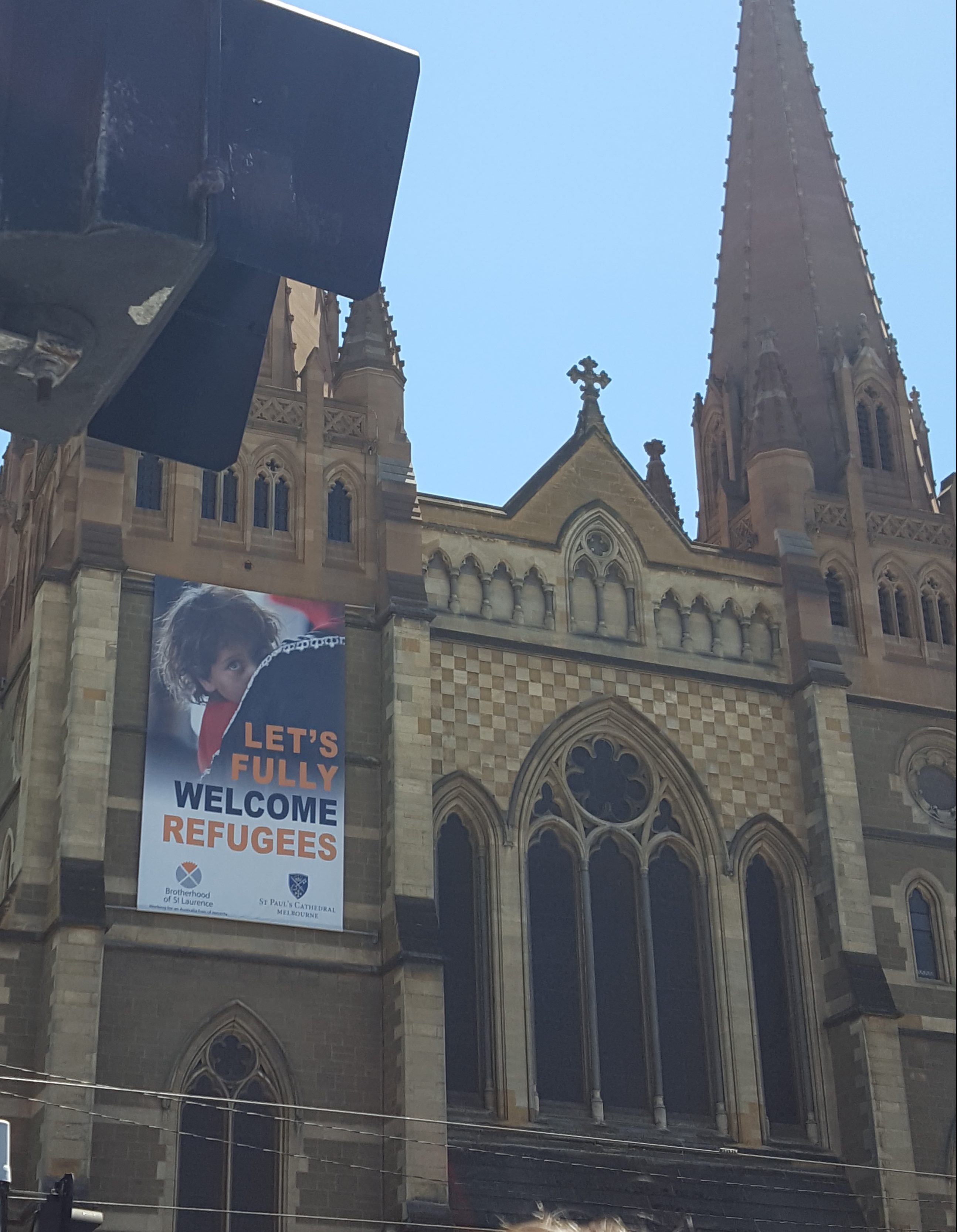 Last Sunday, I was in the CBD. On the corner of Flinders Street, opposite its station, you can see St Paul’s Cathedral, and across the street from it, a the pub, both plastered with billboards that are for the latest NGV exhibition, and the newest musical (Book of Mormons) and with the church, one welcoming refugees. Diagonally opposite the pub, dinky old (classic) Porsche cars are displayed by an owners club at Federation Square. Further down the street, the Masonic building is nudging up to the lavishly ornate Moorish Revival Forum Theatre, which is opposite the angular and modern Ian Potter Gallery, currently displaying an exhibit on the architecture of a new mosque.