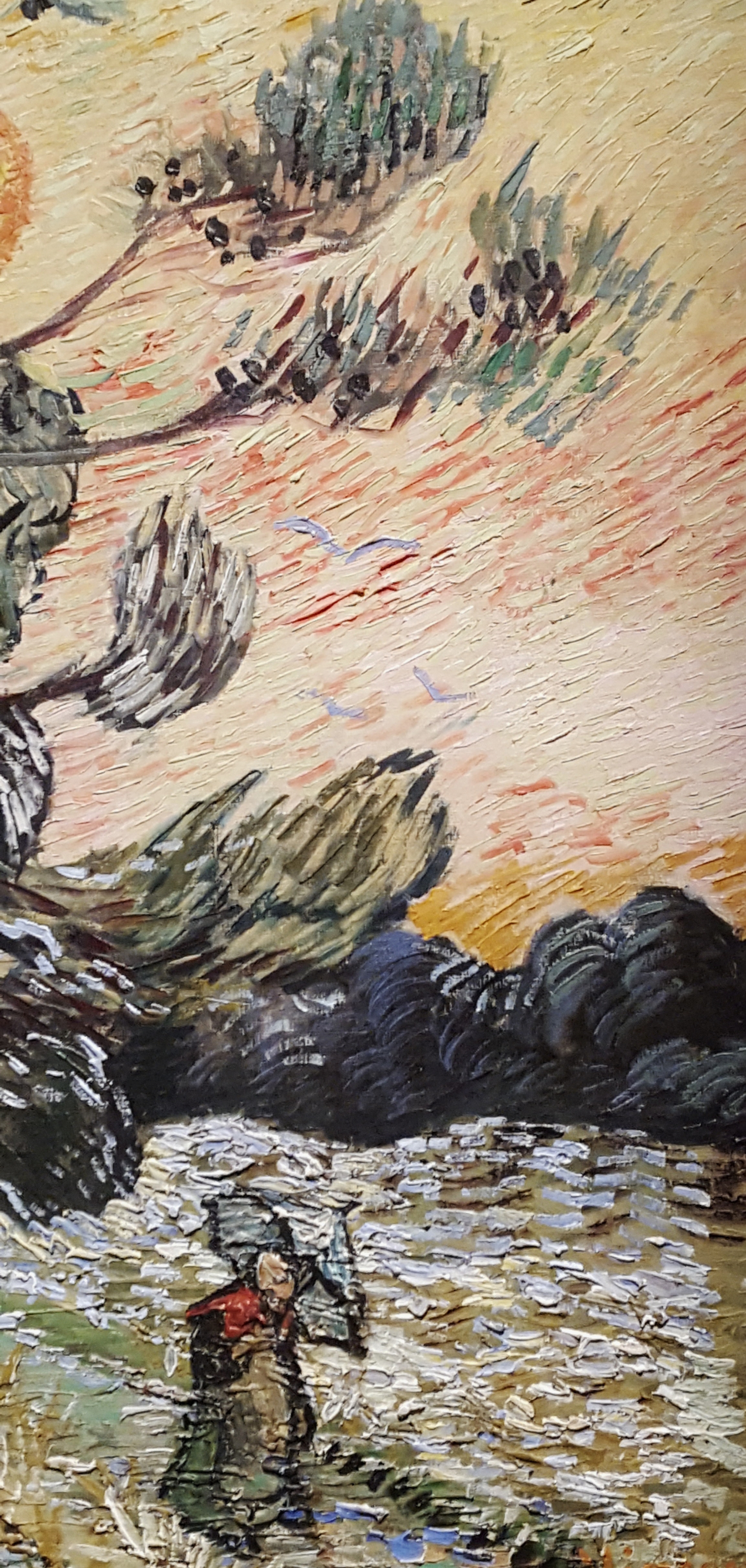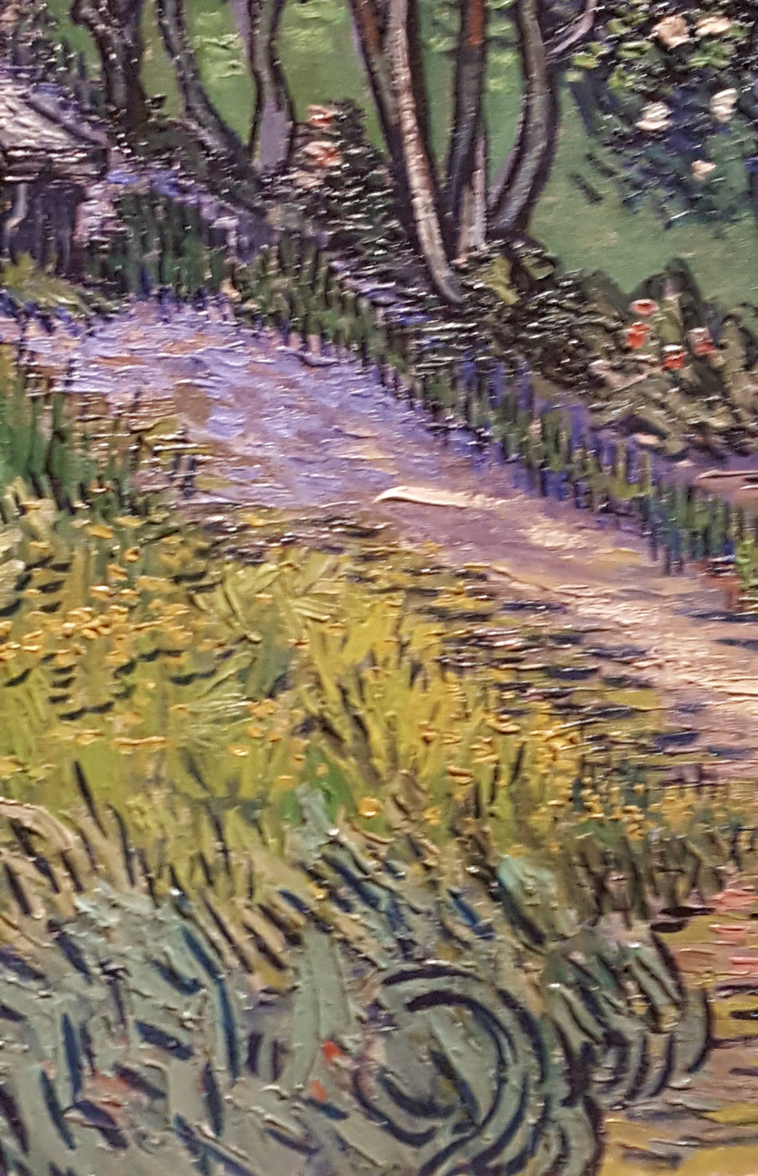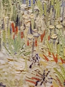 All of this means a print of a van Gogh seems dull and muddy by comparison. It’s two-dimensional rather than his three dimensions. That could be said of any print of an oil painting. However, the Fibonacci swirls in his clouds, the star burst lines of his shrubberies, and fields of sunny vertices make van Gogh’s work instantly recognisable, but also so much more energetic when confronted by the real thing, framed on the wall. Which I why I took few photos of entire paintings, but rather close-ups of sections.