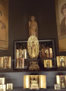 I want to compare it to the inner sanctum, or a reliquary, and it reminded me of the 2014’s excellent Eikon: Icons of the Orthodox Christian World exhibition at the Art Gallery of Ballarat. And yet, Buddhism has its own language. Or perhaps the religious purpose of the art – its context – imbues it with significance? As in all art that is perhaps for each person to explore for themselves. But these votives and statues did seem to speak to me in ways the more modern works of this exhibit did not. Maybe it is the staging, as each communes with others?