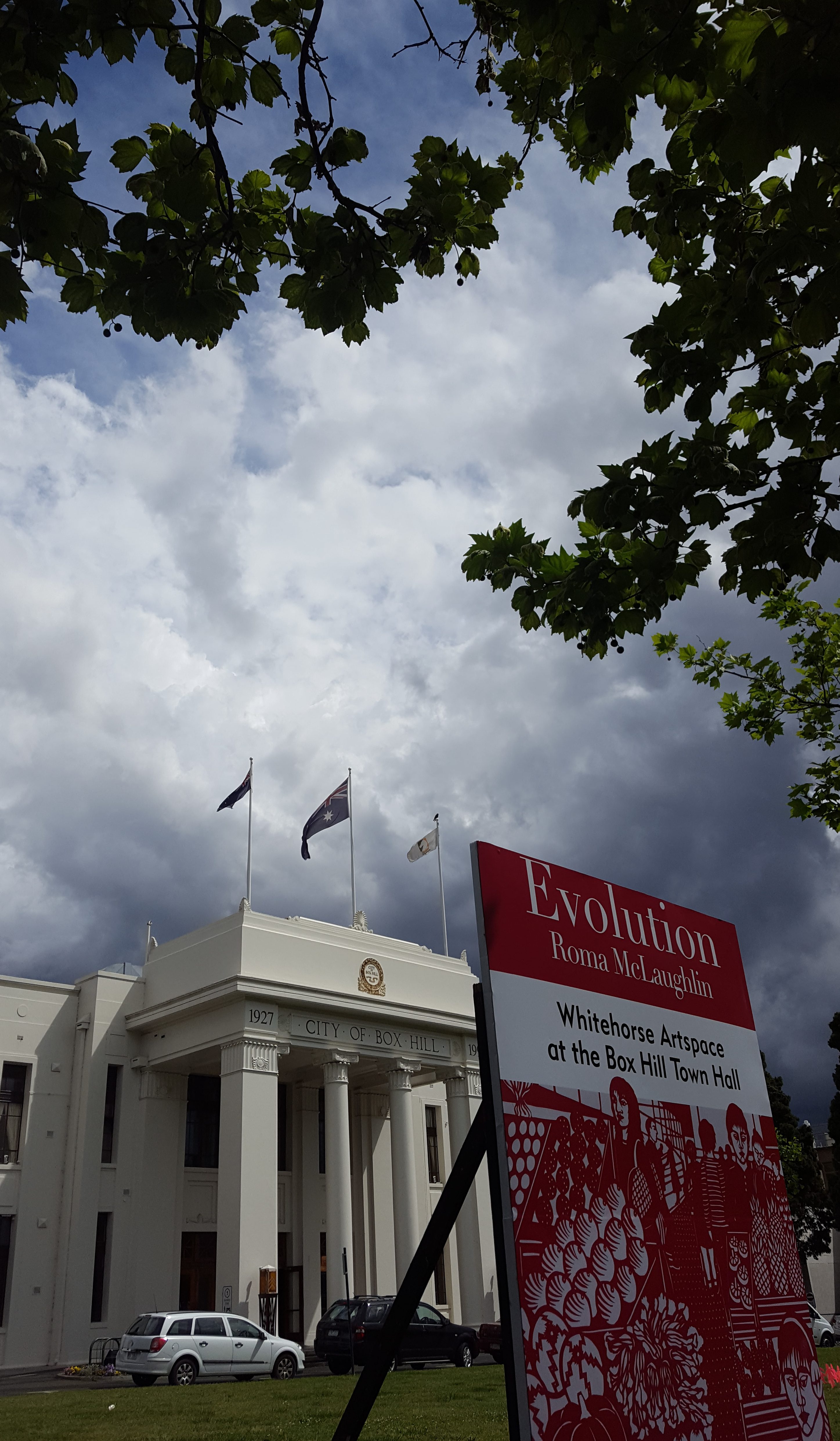 After the exhibition, I left the Box Hill Town Hall’s interior, musing on the connection between art and the every day, what with the imposing formal portrait of a past Councillor overlooking what can only be described as a stairwell.