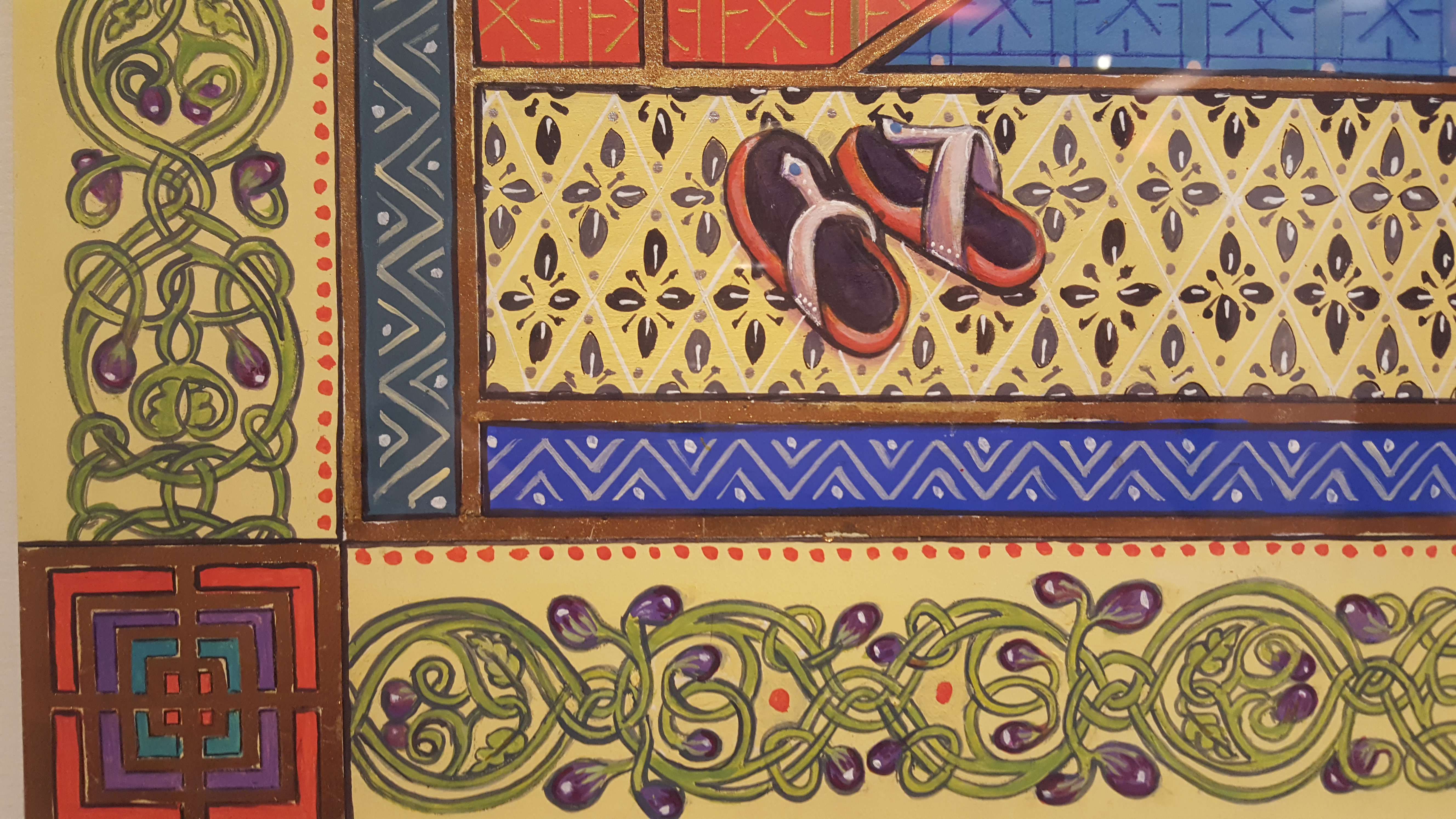 The colour choices and patterns evoke a sense that this is a page out of an antipodean Lindisfarne Gospel. The outermost frame designates the interior scene as a sacred space. To cross into this space we leave our shoes outside the door, and then cross the red threshold.
