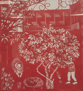 One picture was particularly successful and summed up the show. It was acrylic on canvas, of a kitchen scene, looking out into a garden, beyond which is an apartment building. The kitchen is framed by a red door way that could both be Chinese and Victorian, and the entire picture is framed Celtic-inspired knot work of entwined eggplants.