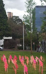 A nice one, but a stairwell none the less. Thinking about all this, I emerged into the torrid afternoon as students made their way home. Girls in school dresses and ribbon bedecked straw hats skirted the Mini Field of Women installation for the Breast Cancer Network Australia. The girls, against the dark sky, were out of a Charles Blackman painting, except for their backpacks, and excepting it was a contemporary, outer suburban part of Melbourne.
