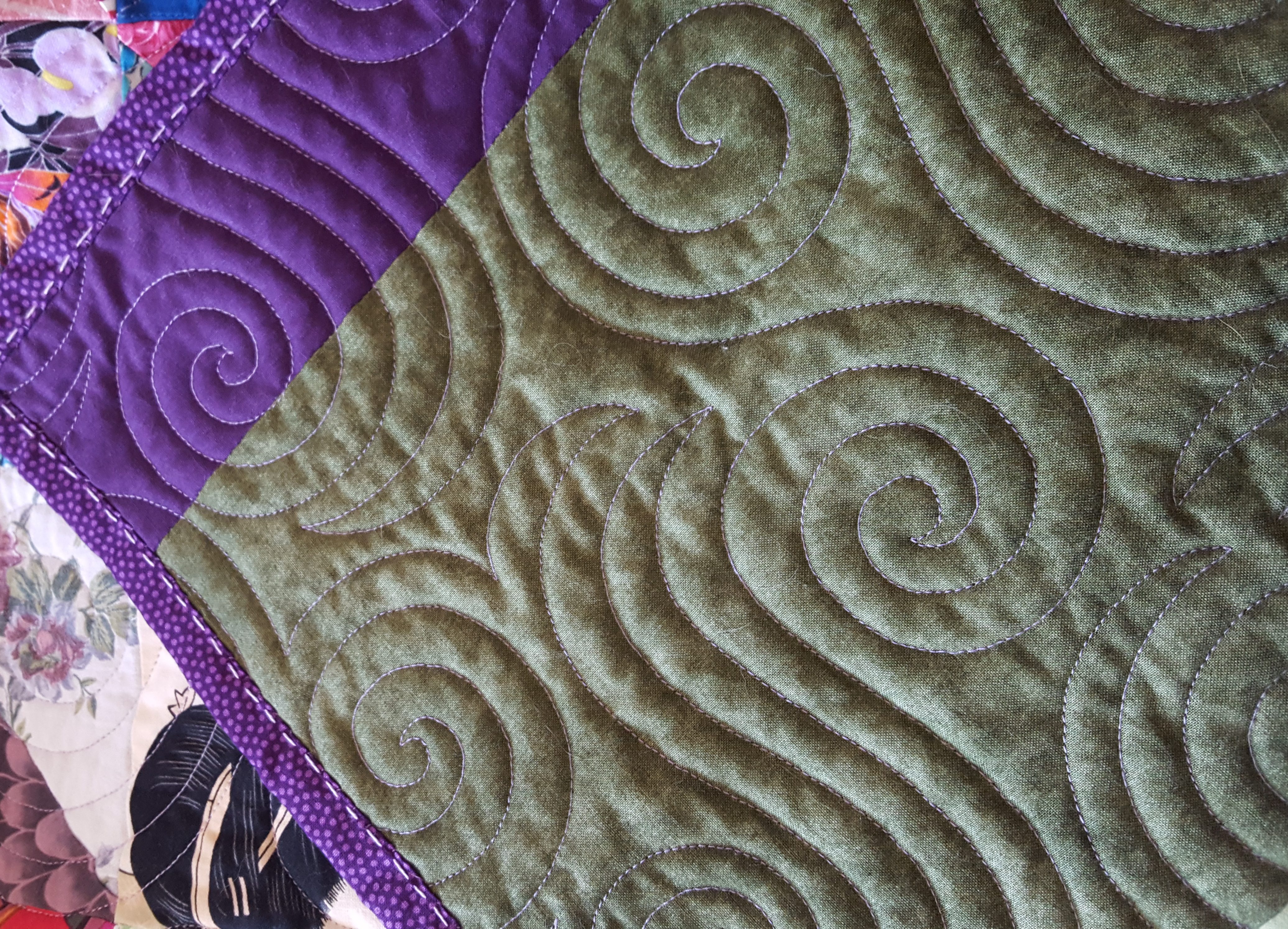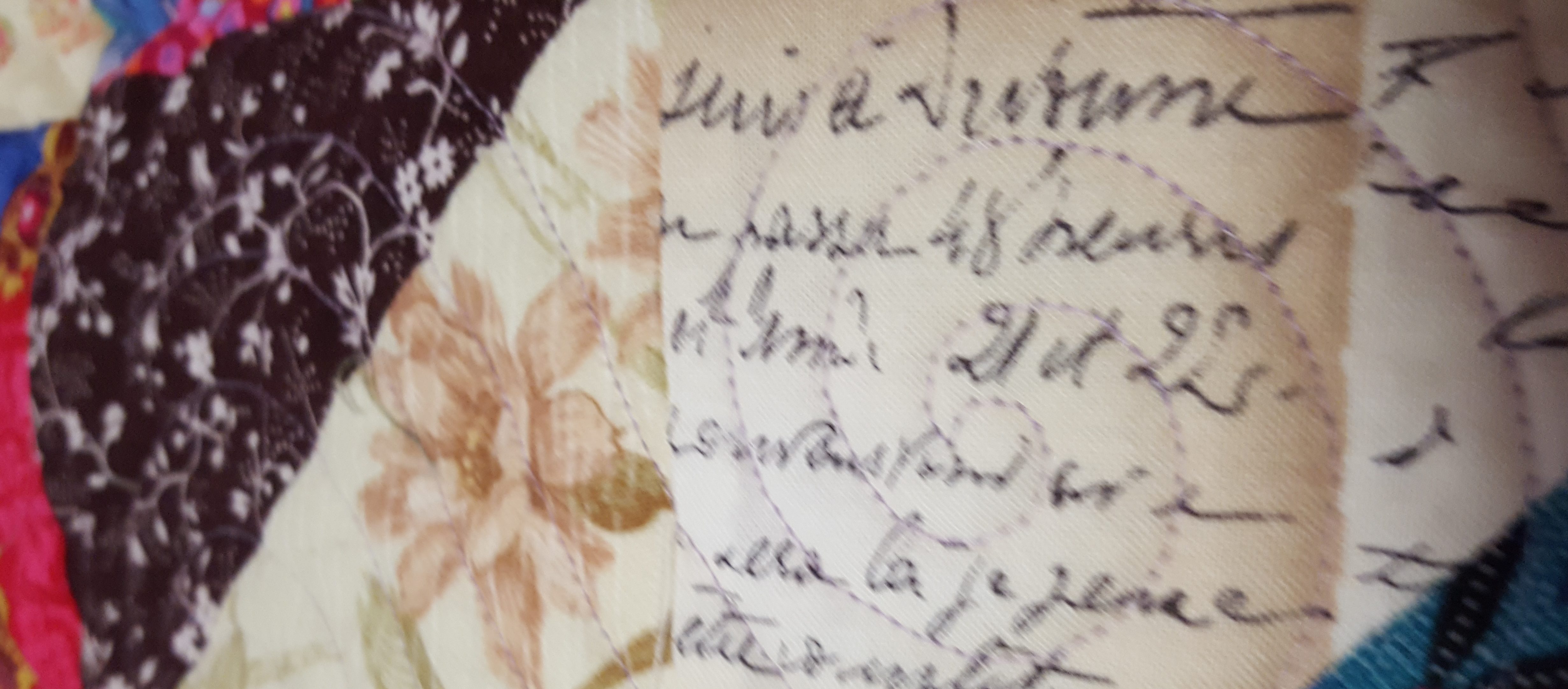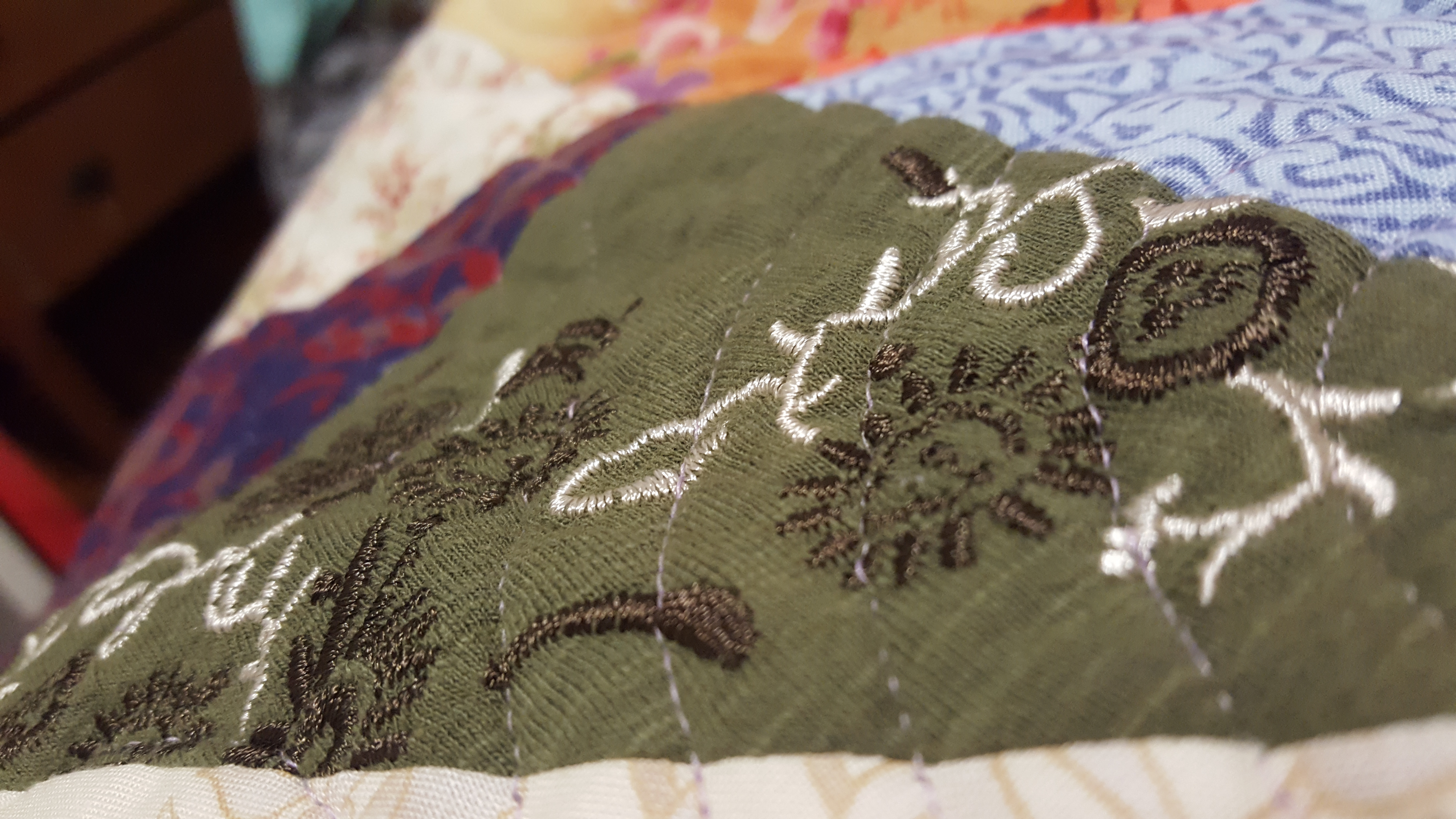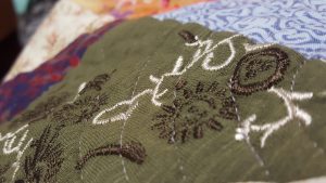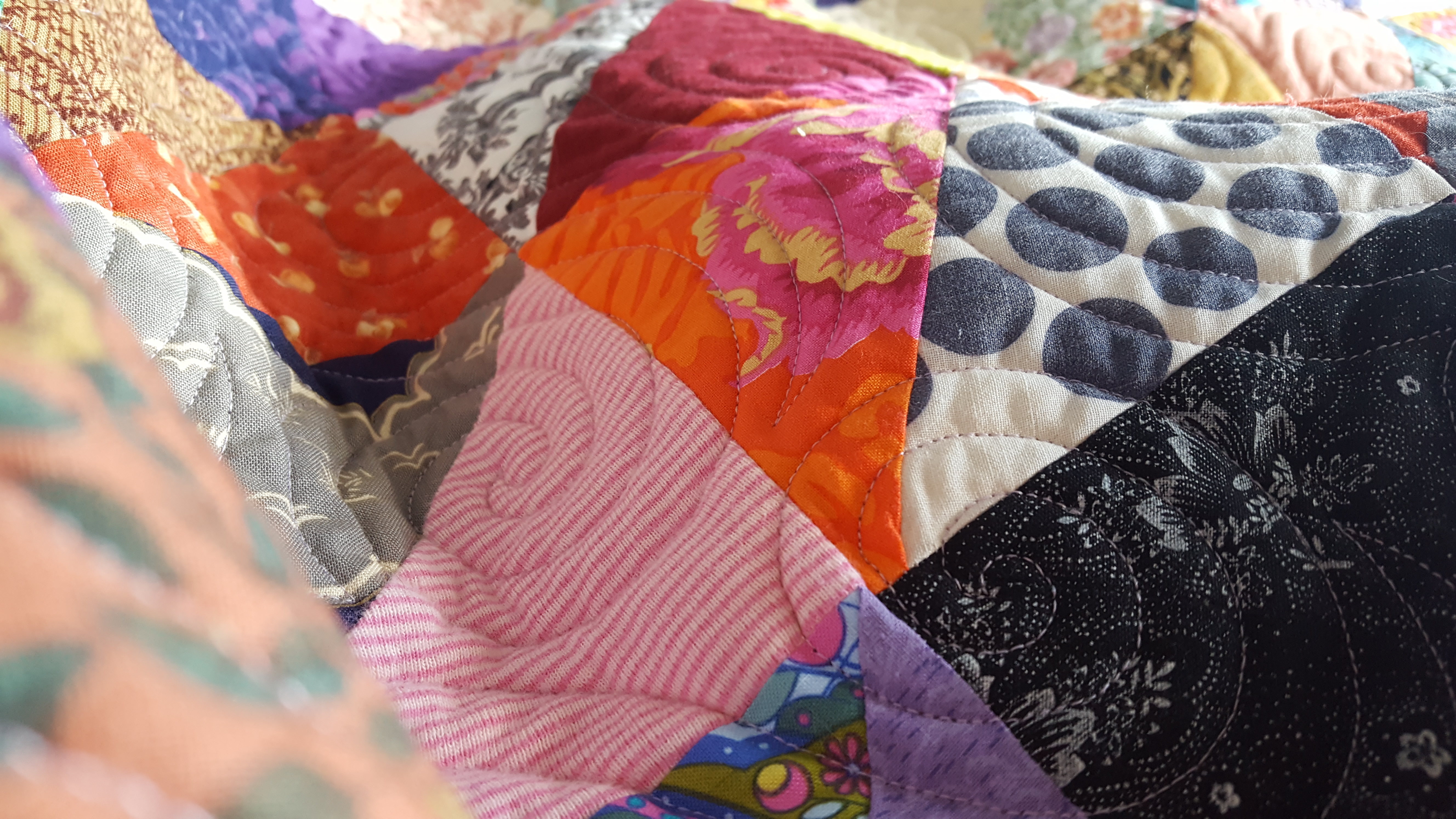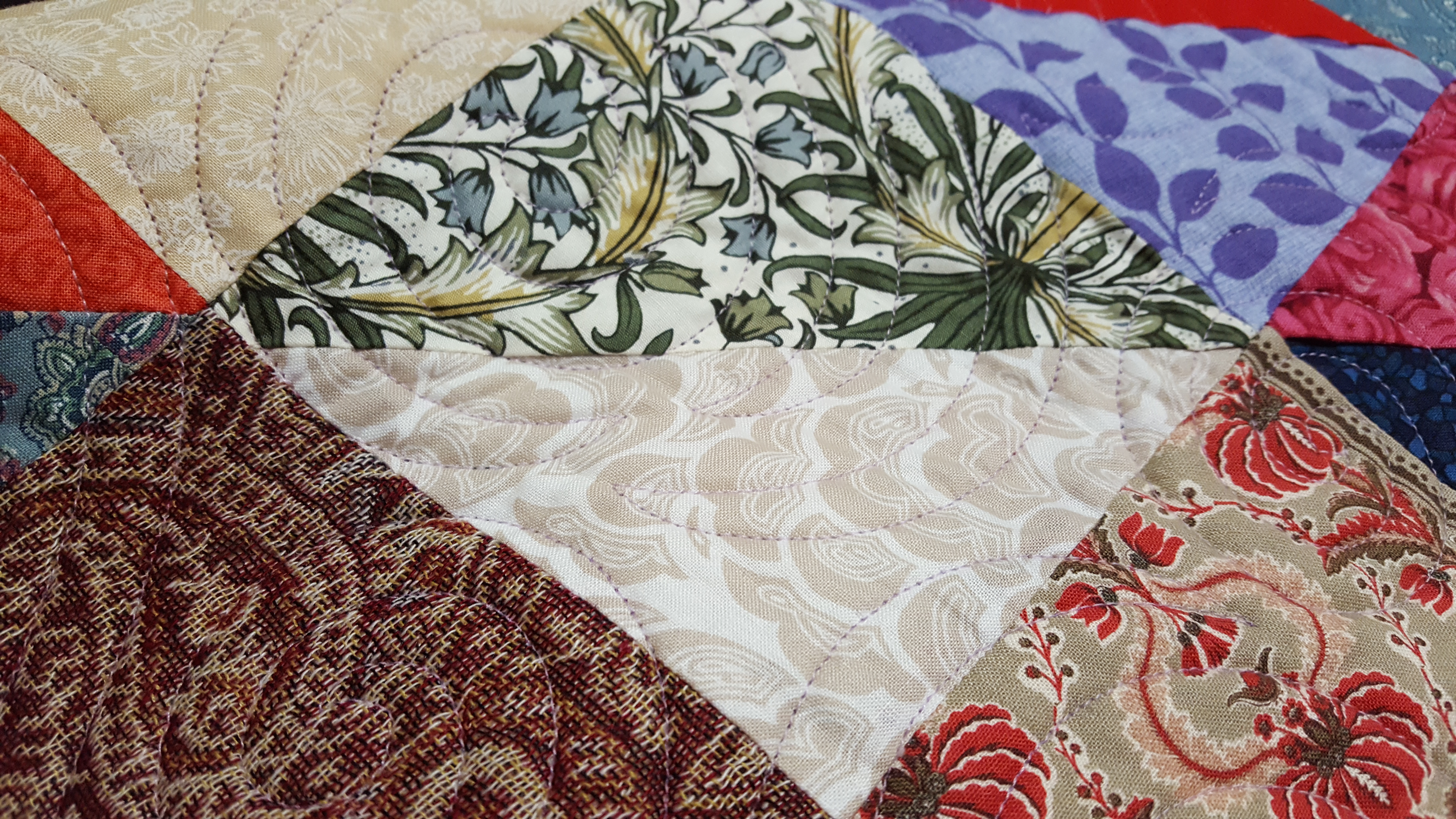 The first night, I couldn’t sleep for looking at it. Tracing its quilted pattern, admiring the clever juxtaposition of florals and colours and different textures. Seeing stories even in bits of unfamiliar material added to enhance the overall effect.