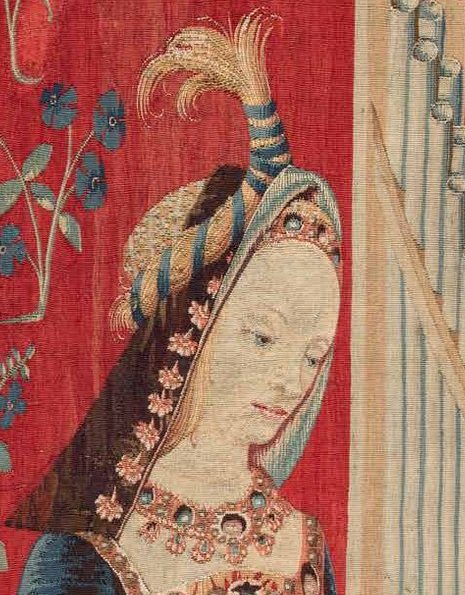 My biggest divergence with common opinion on the Lady and the Unicorn series is I don’t think it’s the same lady in each tapestry. Sure these women are tall, willowy and blonde, but it doesn’t make them the same person. For one, some seem to have blue eyes, and others not so much. And, their foreheads change shape. I understand it took about three years to create each piece and thus, whoever modelled for the original cartoon designs for the tapestries aged as well. So yes, I think the ages of the Lady changes, but I also think she is not the same Lady.