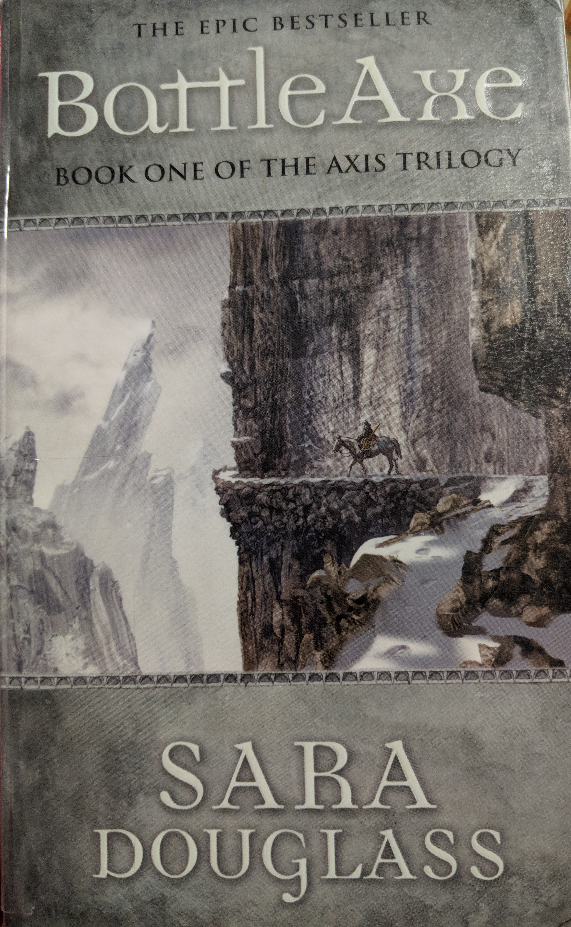 I was walking to the supermarket, passing the usual shops, and, as I said, thinking about this story of the axe and the nature of inspiration.  On my way back home, I ducked into the animal charity store that sells second-hand items, because I liked the look of the ornate candle snuffer in the window and was pondering it for a story. In the book section, I came across BattleAxe. In five years I had never seen Sara Douglass books in this store, and on this day there were two.  Was it a remarkable coincidence, or a message or something else?
