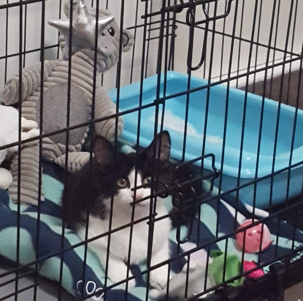 That was her first Friday afternoon at my house. Eventually, she appreciated the security of the crate, and began to drool and purr when spoken to. By Sunday I could put my hand in the crate and get cuddles. Her appetite returned and she started toileting. By the middle of the first week she was enjoying play time. She could run loose in my room to shake out her growing pent-up energy.