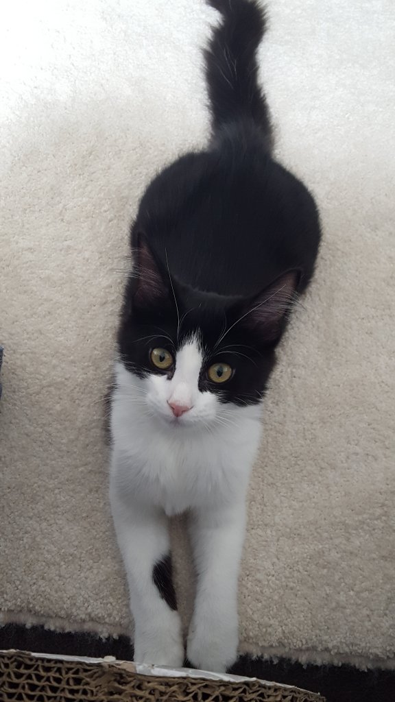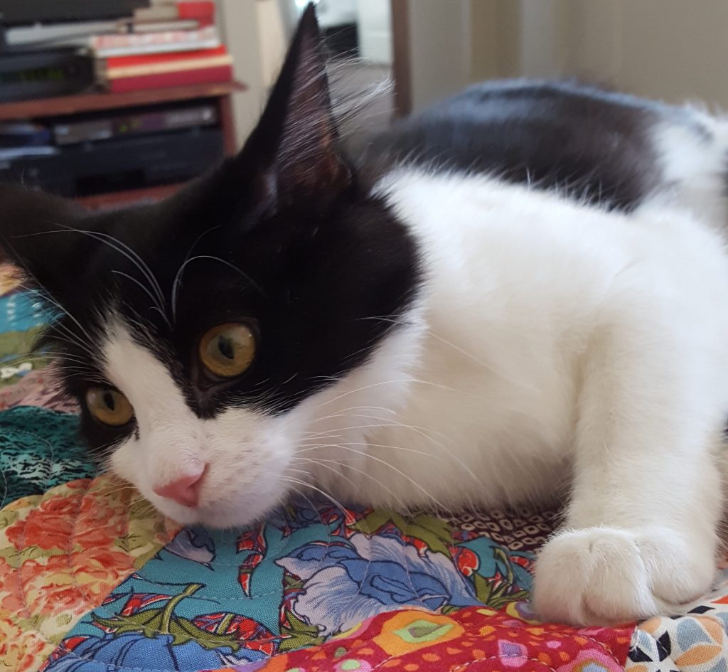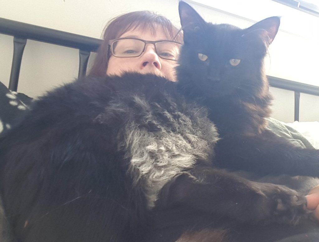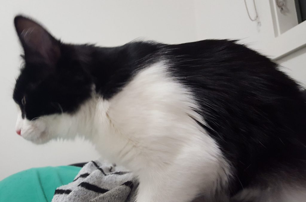 She shouldn’t have been this scared but humans let her down. As they let down countless animals they take on, or refuse to take responsibility for, as pets. After the second week, her brother joined her and she was safe to stay in the spare (now dubbed kitten) room with him. After two months of daily cuddles and other interactions, as well as good food and fun, they were both at normal weight. Molly learned to rub her head against me, and began to sit on my lap for cuddles after breakfast, if she could get to it before her brother Dusty.