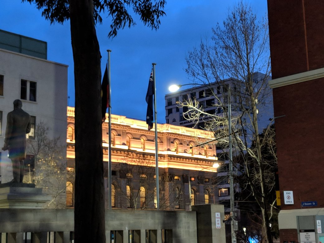 Street lights silver the fake turf. Squealing brakes and the susurration of electric bikes can’t interrupt this contemplative work. The back of Francis Ormond is turned from this.