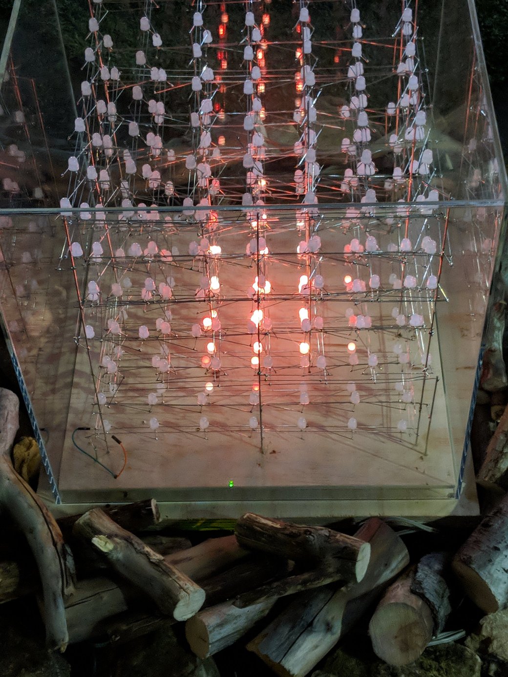 Diodes flare and fade through orange, yellow, passing through green and red, higher and lower. Acting to their own irregular rhythm, they bring an orderly disorder to this geometry.