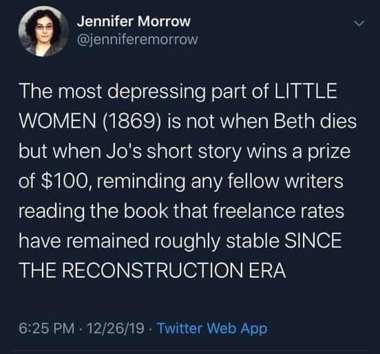 Speaking of ambitions. As a writer, this history feels like fantasy. Imagine earning enough money to support a family from writing short stories? I saw a comment on social media (see below) about how earnings have not changed since the US civil war, and yeah, whoa.
